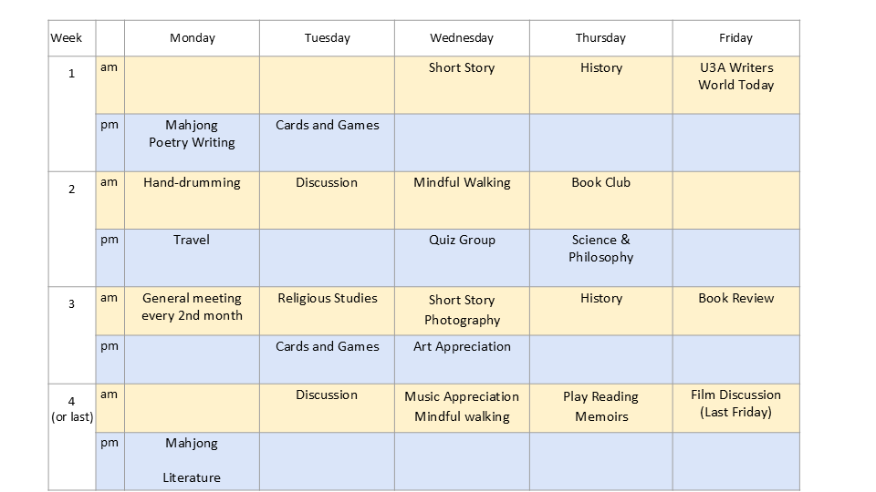 Members are invited every second month to our General Meeting which will be held in St Johns Catholic Chuch Hall in Orewa in 2026.. At these meetings we have had guest speakers including academics from Auckland University and others who spoke on the topics ranging from Auckland's long term infrastructure needs, the Penan people of Borneo, agriculture in Ukraine and Dacre Cottage at Karepiro Bay. Members of the public who would like to join U3A are welcome to come along and see what we are about.
